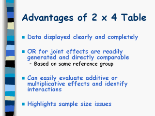| Advantages of using a 2 x 4 table to test for gene-environment interactions are described in this slide. Perhaps the most important is the last one listed. You will be able to readily determine if the number of individuals in any of the cells in the 2 x 4 table is small. Small sample sizes are a major problem when testing for gene-environment interactions because cases and controls are each stratified by 2 factors. This can result in unstable (and overestimated) ORs. |