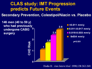 Rate of common CIMT progression was directly associated with higher risk for future MI and CHD death. The Cholesterol Lowering Atherosclerosis Study (CLAS) was a clinical arterial imaging trial designed to study the effects of colestipol-niacin therapy on progression of atherosclerosis in the coronary, femoral, and carotid arteries. The objectives of this long-term follow-up (by Hodis, et al) of the CLAS cohort was to determine whether carotid arterial intima media thickness (CIMT) (expressed as a single measurement or as a rate of change) predicts coronary events. A progressive relationship was noted between the rate of change in common carotid IMT and the risk for MI and CHD death. They concluded that noninvasive B-mode ultrasonographic measurement of progression of intima-media thickness in the distal common carotid artery is a useful surrogate endpoint for clinical coronary events. Data such as these establish the utility of serial measurements of CIMT as an “intermediate endpoint," indicative of possible effects on CHD outcomes. Hodis HN, Mack WJ, LaBree L, et al. The role of carotid arterial intima-media thickness in predicting clinical coronary events. Ann Intern Med. 1998;128:262-269. |