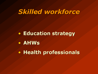 Aboriginal Health Workers (AHWs) are faced with high expectations, often without having been provided with appropriate training or specialised skills. Programs for the training of AHWs are steadily developing. There is a drive for the establishment of teaching health centres. (Ring 1998) There is also a lack of skilled health professionals in remote areas, especially in Indigenous communities. Indigenous people are very poorly represented in the ranks of such professionals. A number of initiatives are now in place to attract medical practitioners to remote communities. |