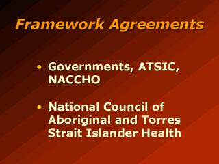 The Commonwealth government has committed itself to a partnership with the State and territory governments, ATSIC and NACCHO (the National Aboriginal Community Controlled Health Organisations peak body). The so-called “Framework Agreements” provide the framework for a collaborative approach to addressing Indigenous health needs, involving government and community organisations, and provide for a partnership approach to planning and priority setting.