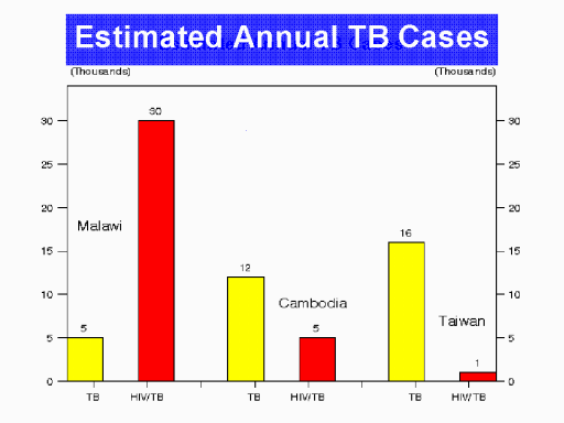 This contrasts with Pneumocystis jiroveci pneumonia (PCP) that usually occurs in HIV-infected persons with less than 200 CD4/mm3. In populations where the prevalence of infection with Mtbc and HIV are both very high, such as in sub-Saharan Africa, huge increases in the annual number of TB cases related to HIV infection can be expected. In Malawi, where there is a high prevalence of both Mtbc and HIV, annual HIV related TB cases will be several times the annual number of TB cases who are HIV negative. In Cambodia, where there is a high Mtbc prevalence and a relatively high HIV prevalence, annual HIV related TB cases will be about half of the annual TB cases without HIV and in Taiwan, where Mtbc infections are moderate and HIV prevalence is low, annual HIV-related TB cases will be less than 10% of the annual TB cases that are HIV negative. |