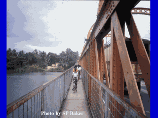 crossing the river using the safe walkway because it is easier than