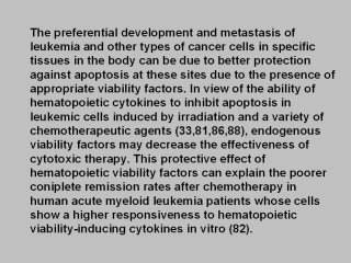 | Leukemic cells from acute myeloid leukemia patients can express high levels of the bcl-2 gene (89) which suppresses apoptosis (90), and in these leukemic cells GM-CSF upregulated expression of bcl-2 (89). It has been suggested that reducing the level of viability-inducing cytokines or the responsiveness of cancer cells to these cytokines may be clinically useful in cancer therapy (33, 81, 86). |