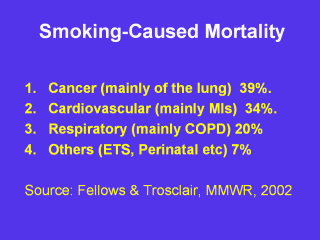 | This slide shows the proportion of smoking-caused deaths caused by each type of illness, in the USA each year. |