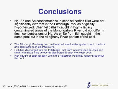 Allegheny River portion of the pool. The Pittsburgh Pool may be considered a locked water system due to the lock and dam system on all area rivers. Pollution discharged into the Pittsburgh Pool from industrialized sources and sewer overflows may be evenly distributed through the water body. Fish caught at each location within the Pittsburgh Pool may range throughout the pool.Volz et al.,2007; APHA Conference: http://www.pitt.edu/~cdv5/ |