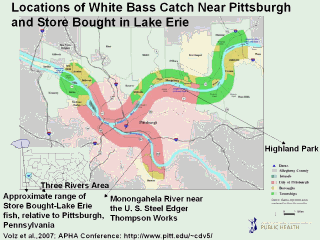 The large map expands the view of three rivers of Allegheny county, which are Allegheny river, flows from northeast to southwest, the Monongahela river which flows north to Pittsburgh from West Virginia, and the Ohio river formed at the junction of the Allegheny and Monongahela rivers. Presented on the map are the locations of catfish catch within the Pittsburgh Pool, at the highland park dam on the Allegheny, at the U.S. Steel Edger Thompson Works on the Monongahela and at the confluence of the Allegheny and Monongahela rivers at Point State Park. We chose an upstream location at Kittanning, PA on the Allegheny River, to catch catfish because local fishers said in focus groups that they preferred to eat fish caught from this area because the water is cleaner. Kittanning is located around 36 miles upstream from Pittsburgh on the Allegheny river in Armstrong county, highlighted in orange color in the county map on the lower left. We also purchased channel catfish from local fish market for comparison purpose. These fish came from a Georgia Fish Farm.