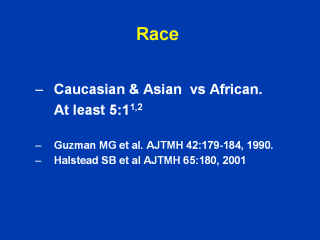 | Perhaps the strongest intrinsic control of dengue severity among humas has been attributed to a dengue resistance gene in individuals of subsaharan African origin. This phenomenon was described during the 1981 DHF/DSS outbreak in Cuba and verified by the absence of DHF/DSS in Haiti, a dengue-hyperendemic country with a predominantly black population. |