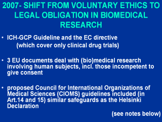Association The Council of Europe Protocol would seem to adopt the most restrictive interpretation, as it deals only with research which entails “interventions” on human beings. However, the question is how broad this should be interpreted. The position of the CDBI is that any form of contact with a research subject would constitute an intervention; therefore, also questionnaires, interviews and observational research come within the scope of the Protocol. The revised Declaration of Helsinki is rather wide in its scope, as according to Art.1 “medical research involving human subjects includes research on identifiable human material or identifiable data”. On the other hand, it does not elaborate this, so it remains unclear to what extent for instance research with already available human tissue needs prior approval by an ethics committee. The most comprehensive approach is adopted in the CIOMS guidelines. They do not define “biomedical research involving human subjects”, but as a matter of fact they also cover secondary use of research records and specimens as well as research on patient records and on blood or tissue samples taken in the course of clinical care. These issues, however, are dealt with only briefly and without much regard to the specific nature of the different kinds of research scope is substance. Also in this respect variation exists, be it on some points more than on others.9 A conspicuous example – which is also relevant in a human rights perspective – is the rotection afforded to persons who are not able to give consent to their participation in medical research, in particular non-therapeutic research. Separate set of standards on non-therapeutic medical research. In case a research subject is incapable of giving consent, consent must be obtained from the legally authorized representative. Incompetent persons should not be included in research, unless the research is necessary to promote the health of the population represented and this research cannot instead be performed on legally competent persons (Art.24). Although this provision sets limits to the inclusion of incompetent persons, it does not exclude non-therapeutic research with them. The same holds for Art.26 which further specifies the necessity and subsidiarity principles expressed in Art.24.10 The proposed CIOMS guidelines include (in Art.14 and 15) similar safeguards as the Helsinki Declaration.11 Furthermore, there is an additional guideline dealing with (research) interventions that do not hold out the prospect of direct benefit to an (incompetent) individual (Guideline 5); it requires that the risk of such interventions should be no more likely and not greater than the risk attached to routine medical or psychological examination of such persons. However, “slight or minor increases above such risk may be permitted when an ethical review committee is persuaded that the object of the research is sufficiently important”. According to the explanatory text “the meaning of this standard is inferred from what various research ethics committees have reported as having met that standard”, including “the performance of additional lumbar punctures or bone-marrow aspirations in children having conditions for which such examinations are regularly indicated in clinical practice”. Unfortunately, this would seem to set hardly any limits to the interventions that can take place in non-therapeutic research with incompetent persons. In this respect, the draft Council of Europe Protocol provides much more protection to persons not capable of giving consent. Research that has not the potential to produce results of direct benefit may only be carried on them by way of exception and under additional conditions, including among others that the research entails only minimal risk and minimal burden for the individual concerned and that any consideration of additional potential benefit of the research shall not be used to justify an increased level of risk of burden (Art.18). According to Art.20, research bears minimal risk if it is to be EDITORIAL 297 expected that it would result, at the most, in a very slight and temporary negative impact on the health of the person concerned; for the burden to be minimal, it is required that it is to be expected that the symptoms or unpleasantness will be, at the most, temporary and very slight. These strict provisions do more justice to the human rights of this vulnerable group of persons than (in particular) the draft CIOMS guidelines. |