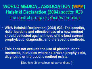 Department of Public Health & Human Research Ethics Committee University of Tartu The WMA hereby reaffirms its position that extreme care must be taken in making use of a placebo-controlled trial and that in general this methodology should only be used in the absence of existing proven therapy. However, a placebo-controlled trial may be ethically acceptable, even if proven therapy is available, under the following circumstances: - Where for compelling and scientifically sound methodological reasons its use is necessary to determine the efficacy or safety of a prophylactic, diagnostic or therapeutic method; or - Where a prophylactic, diagnostic or therapeutic method is being investigated for a minor condition and the patients who receive placebo will not be subject to any additional risk of serious or irreversible harm. All other provisions of the Declaration of Helsinki must be adhered to, especially the need for appropriate ethical and scientific review. |