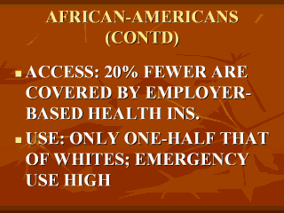 insufficient for those needing help, as we have seen. AA clinicians: 5x more likely to see AA patients than are white clinicians. But only 2% of psychologists and psychiatrists are AA (4% of social workers). In addition, location of these practitioners (urban areas) does not match where most AA’s living in rural South and many urban pratitioners do not accept Medicaid. Finally—STIGMA against seeking mental health services is strong Source: Culture, Race, and Ethnicity: A Supplement to Mental Health: A Report of the Surgeon General. |