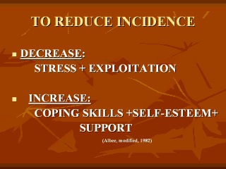 | Albee’s formula: NUMERATOR (DEFICITS) ____________________ DENOMINATOR (STRENGTHS) In his formula, he included Organic factors in numerator. e.g.: Colorado Separation and Divorce Program for newly separated persons (Bloom & Hodges): saw separation during the first six months as a stressful life event that provided an opportunity for divorce prevention. Group program that addressed both skill enhancement and social support. |