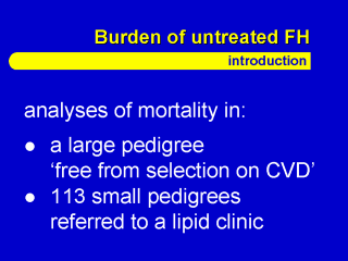 present study is: 1 to analyze the natural history of FH free from selection on cardiovascular disease (large pedigree). 2 to analyze the effect of age, gender, the presence of additional risk factors for cardiovascular disease, and the type of mutation on the burden of the disorder. (113 small pedigrees of lipid clinic) |