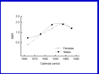The point estimates of the SMRs for men and women over time show that mortality from FH rose in the 20th century, peaking between 1935 and 1964 with an SMR of 1.59 among persons with 50% probability of being affected. |