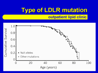 | After adjustment for sex and time by Cox's proportional hazards model, the mortality risk of the relatives of carriers of null alleles compared to those with other mutations was 1.05 (95% CI 0.63-1.74, p=0.8). This indicates that allelic heterogeneity is a minor source of variance of mortality from FH. However, we cannot exclude the existance of other mutations of the LDL receptor that are associated with better or worse life expectancy. |