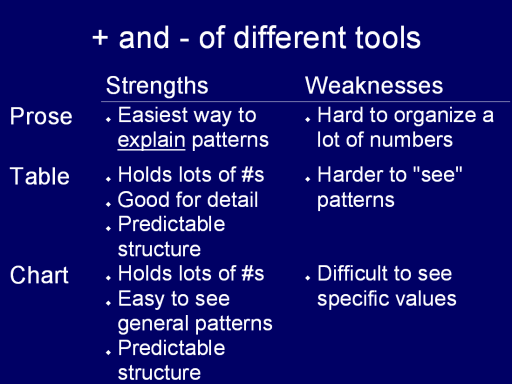 for presenting numeric information: Prose, tables, and charts. Each