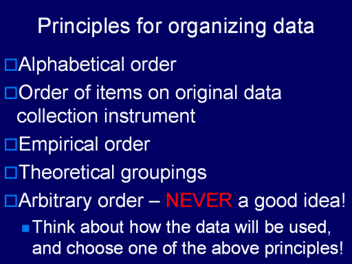 One principle to avoid is arbitrary order – whatever order you happen to recall the categories or items you seek or organize! The rest of this lecture will define and demonstrate each of these other principles and explain how to determine which one best fits the task at hand.