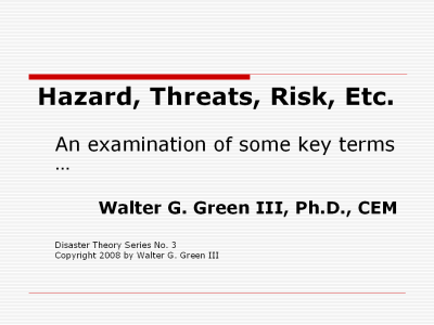 | A variety of terms are commonly used to express relationships between events and their outcomes. This presentation offers what I believe to be a coherent set of definitions for these terms and an explanation of their interrelationships consistent with an overall view of disaster. |