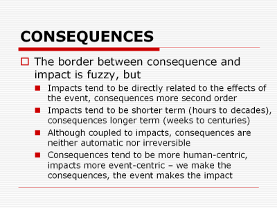 interact with the impact creates the consequences: - Consequences become second order outcomes, logically following the impacts. - The impact will tend to be the first to occur on the timeline, with consequences extending beyond the cessation of impact. - Consequences may be variable and not automatic, they may be reversible – and the bad consequences may be preventable by relatively simple changes in attitudes, beliefs, and value systems. |