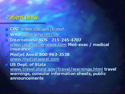 WHO www.who.int/ith International SOS 215-245-4707 www.internationalsos.com Med-evac / medical insurance Medjet Assist 800-963-3538 www.medjetassist.com US Dept. of State www.travel.state.gov/travel/warnings.html travel warnings, consular information sheets, public announcements |