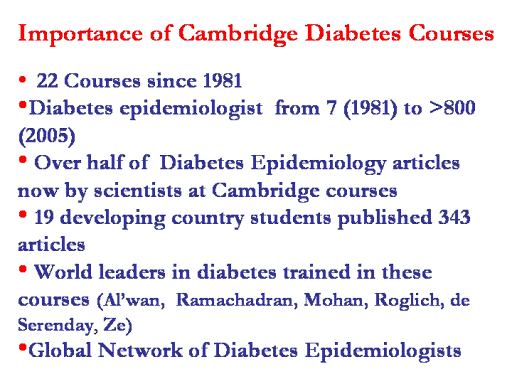 The Cambridge course has established the field of diabetes epidemiology world wide. The trainees from the course are global leaders and the major scientists in diabetes prevention. They now occupy may very high positions. We plan to develop a similar program for the field of NCDs |