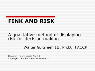 purposes of this presentation I will refer to this as Fink’s Matrix. Fink’s Matrix uses numbers to assign values of impact and probability to specific hazards or threats. I view this as a qualitative assessment, rather than quantitative, because of the importance of expert judgment in the assessment process. The user could equally well view, and promote, this tool as being an essentially quantitative one. The narrower the threat considered and the more accurate the data, the more this becomes quantitative rather than qualitative. Source: Fink, Steven, Crisis Management: Planning for the Inevitable, New York, New York, American Management Association, 1986. |