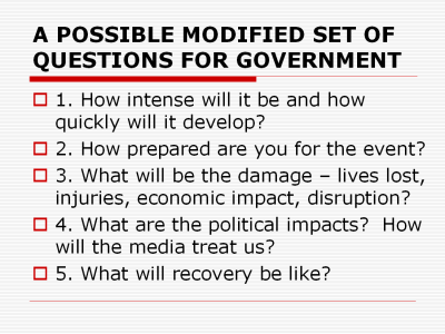 | For example, this might be a reasonable set of questions for use in the analysis of risk by a governmental emergency management agency. Note that these questions are my formulations, and not those by Fink. Fink does not specifically address governmental response. |