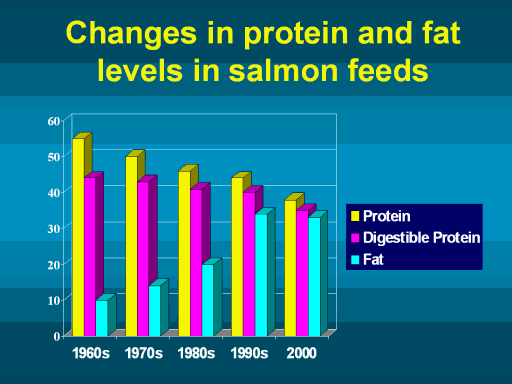 decades, the amount of protein in trout feeds has increased from 36% to