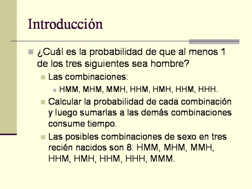 probabilidad de tres mujeres (MMM) sería 0.55 x 0.55 x 0.55 = 0.1664