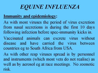 | Diagnosis: Virus isolation: Samples are taken from several horses because only a low proportion may be excreting virus. Deep nasal swabs are collected by inserting a long swab 12 inches into each nostril - this requires practice! THE SWAB IS deposited INTO 10 ML TRANSPORT MEDIUM (sterile basic salts solution containing antibiotics), transported at 4OC and frozen at -70OC. In the 1998 UK outbreak egg isolations were negative but 3 viruses was isolated using canine kidney cell cultures with trypsin in the medium, (to cleave Ho) These virus was then used for sequencing. Antigen detection: Directigen Flu A is a commercial antibody capture ELISA for type A antigens of nucleoprotein in swabs. It does not tell the lab which subtype is involved. Serology: Following clinical disease a 4 fold increase in serum antibody to H7 of equine 1 or H3 of equine 2 will occur between bleeds taken during the acute and convalescent phase (2 weeks later). This antibody can be detected by haemagglutination inhibition (HI) and will say whether virus is equine 1 or 2. Diagnostic tests are done by J.A. Mumford, A.H.T. PO Box 5, Newmarket, as part of virus-profiling. |