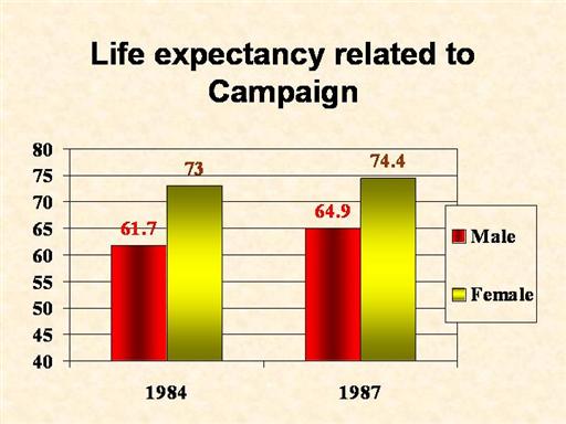 life expectancy at birth increased from 61.7 to 64.9 years for men, and