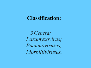 | Paramyxoviruses: Newcastle disease (NDV) termed avian paramyxovirus serotype 1* Other avian paramyxoviruses (serotypes2-9) Bovine parainfluenza 3* Murine parainfluenza 1 (Sendai)* Canine parainfluenza 5* Pneumoviruses: Morbilliviruses: |