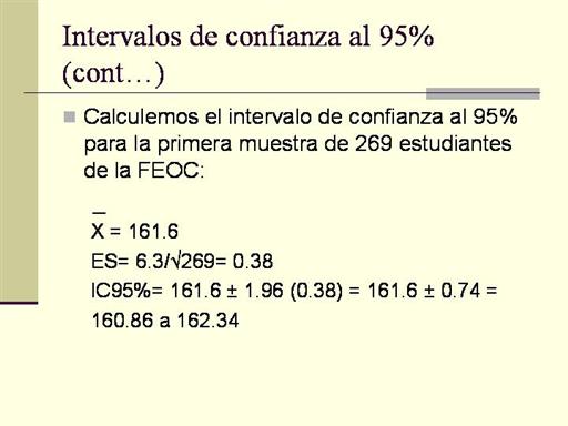 Yo tengo 95% de confianza de que la verdadera media de la población está entre 160.86 y 162.34.