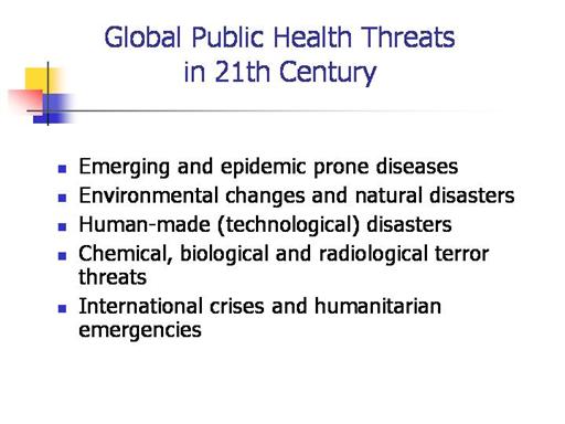 Emerging and epidemic prone diseases: new, highly contagious diseases, such as SARS and avian influenza, know no borders. In the last few decades, new diseases began emerging at an unprecedented rate of one or more per year. From 1973 to 2000, 39 infectious agents capable of causing human disease were newly identified. The development of microbial resistance is more worrying situation that could change the structure of morbidity and mortality in the world. .