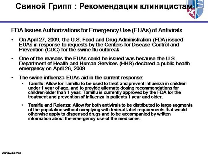 | FDA authorizes emergency use of influenza medicines, diagnostic test in response to swine flu outbreak in humans [news release]. Rockville, MD: U.S. Food and Drug Administration. April 27, 2009. http://www.fda.gov/bbs/topics/NEWS/2009/NEW02002.html. Accessed April 28, 2009.