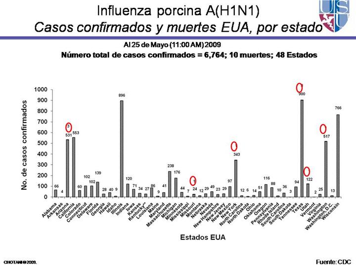 El broten en los EUA inició durante la última semana de Abril. Basado en la naturaleza del brote (curva epidemiológica de México) hay elevada probabilidad de que el pico courrirá en la última semana de Mayo /primera de Junio y el brote cederá en la segunda/tercera semana de Junio. |