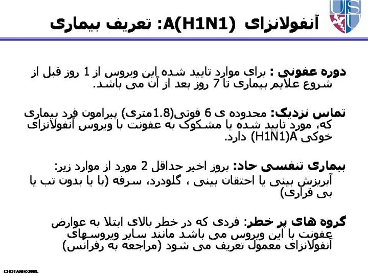 کسانی که بیش از 7 روز بیمار هستند باید بالقوه مسری در نظر گرفته شوند تا زمانی که علایم بهبود یابند.کودکان به خصوص کودکان کم سن تر می توانند بالقوه برای مدت طولانی تری مسری باشند.مدت عفونت ممکن است بر حسب نژاد ویروس آنفولانزای خوکی A(H1N1) متفاوت باشد. Reference: MMWR: Prevention and Control of Influenza: Recommendations of the Advisory Committee on Immunization Practices (ACIP), 2008.
