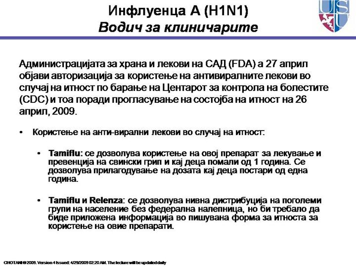 FDA ја авторизира итноста за користење на лекови за инфлуенца. Rockville, MD: U.S. Food and Drug Administration. April 27, 2009. http://www.fda.gov/bbs/topics/NEWS/2009/NEW02002.html. Accessed April 28, 2009.