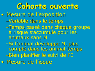 L'exposition peut être plus difficile à mesurer dans une cohorte dynamique que dans une cohorte fermée.  En effet, l'évolution de l'exposition avec le passage du temps doit être mesurée dans une cohorte ouverte.  Il faut donc bien organiser la période de suivi afin de déterminer non seulement l'incidence de M, mais également l'évolution de l'exposition dans le temps.