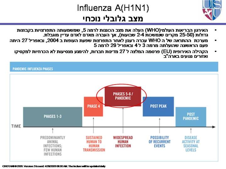 Overview of WHO’s Pandemic Alert Levels Phase 3 of the pandemic alert period is when there are human infections with a new sub-type, but there is no human-to-human spread (or at least very rare instances of spread to a close contact). At this point, the new virus subtype must be characterized rapidly to ensure early detection, notification and response of additional cases. Phase 4 may occur when there are small clusters (e.g., <25 human cases lasting <2 weeks) with limited human-to-human transmission, but spread is highly localized (which suggests the virus does not adapt well to humans). During this phase, WHO describes a variety of measures (such as targeted use of antiviral medications) aimed at containing the virus within a limited area or to delay spread to buy time to implement preparedness measures, such as vaccine development. Phase 5 may occur when there are large clusters (e.g., 25-50 cases lasting 2 to 4 weeks), but human-to-human spread is still localized. The virus may not yet be fully transmissible. At this point, it is imperative to continue efforts to contain or delay spread of the virus, to both avert a pandemic and to implement pandemic response measures. Phase 6 is when transmission to the general population has increased and is sustained, meaning there is a pandemic. All efforts to minimize the impacts of the pandemic are necessary at this time. |