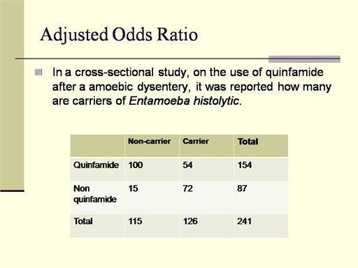 Raw OR is (11 x 72)/ (54 x 15) = 8.89. Non-carriers had likelihood of take quinfamide almost 9 times more than carriers. |