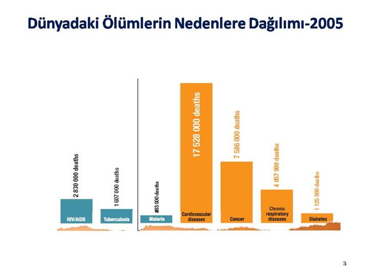 2005 yılında meydana gelen 58 milyon ölümün 35 milyonu, başka bir değişle %60’ı kronik hastalıklara bağlı. Bu yıl için kanser ölümleri tüm ölümlerin %13 |