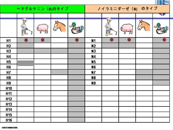 A型インフルエンザは、アヒル、豚、鶏、鯨、馬、アザラシなど多くの動物にも見られます。 A型インフルエンザには、16種類のヘマグルチニン(H)と9種類のノイラミニダーゼ(N)の亜型があり、野鳥ではすべてのタイプが発見されています。 もとからA型インフルエンザウイルスのすべてのタイプは野鳥に潜んでいて、それが他の動物にも伝わっていったと考えられています。 ほとんどのインフルエンザウイルスは、鳥に感染しても症状が出ないかあるいは軽い症状ですみます。しかし、どのような症状が感染した鳥に現れるかは、ウイルスのタイプによって異なります。 A型インフルエンザの例えばH5、H7のようなタイプでは、ある種の野鳥、鶏や七面鳥といった家禽に広く感染して死に至らしめることがあります。 豚は、豚固有のインフルエンザだけでなく、人間と鳥のどちらのインフルエンザにも感染します。感染した豚の症状は人間のものに似ていて、咳、発熱、鼻水といったものです。豚は、豚、人、鳥のいずれのインフルエンザにも感染するので、別々の種(アヒルと人間)に感染する複数のウイルスに同時に感染することがあります。そうなると、ウイルスの遺伝子が混ざり合い、新型のウイルスが生まれる可能性があります。
