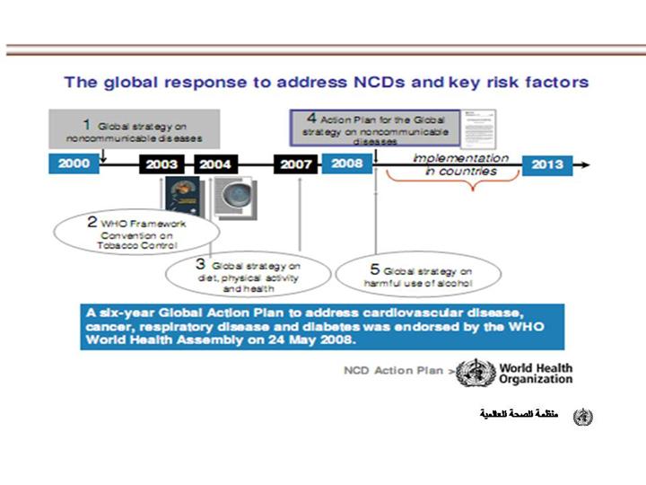 رد الفعل العالمي تجاة الأمراض غير المعدية و عومل الخطورة الرئيسية استراتيجية عالمية لمدة ست سنوات وخطة عمل لمعالجة أمراض القلب والأوعية الدموية في البلدان التي أقرتها جمعية الصحة العالمية |