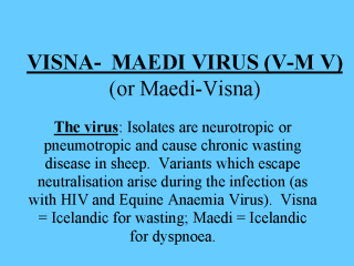 and clinical signs: V- MV undergoes a primary replication in lung macrophages. which carry virus to the target organs, the brain, lung tissue, udder and/or joints according to the isolate. Target organs become chronically inflamed after 2- 6 years of T cell responses to bouts of replication and the sheep rapidly lost condition and fall behind during flock movements. In Visna inflammation results in demyelination with subacute meningitis around the ventricles and choroid plexus. Posterior paresis progresses for up to one year when the sheep can no longer stand. In Maedi the alveolar septa become infiltrated by lymphocytes and macrophages and the smooth muscle becomes hypertrophic (compensatory hypertrophy). Sheep become increasingly dyspnoeic and deaths occur after 6 months. At post-mortem the lungs are heavy, rubbery and do not collapse. |