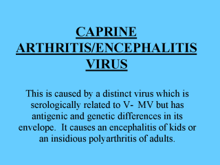 rare. Transmission is favoured by batch- mixing of milk and pooling colostrum. Control: Separate kids from virus positive mother at birth. Give mother's colostrum, pretreated 560C 1hr to kill virus, and rear on artificial milk after that. The VM test can be used to remove antibody +ve stock. |