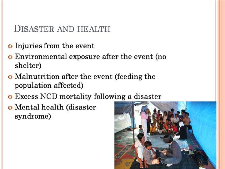 Disasters consequences range between short and long-term. Effective assessment can establish the base for appropriate actions. This can serve well in lessening the burden of disaster and enhancement of coping. Nursing education acknowledges mental wellness by itself an outcome , however, it is also looked as the key for physical well being. |