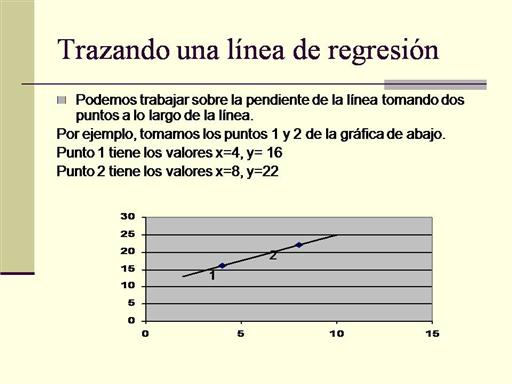 La pendiente, b, está dada por el cambio en y, dividido entre el cambio en x. ¿Cuál es el valor de b? Cambio de y, (22-16) = 6 /cambio de x (8-4) = 4 b = 1.5 La intersección, a es el valor donde la línea de regresión cruza el eje y, o sea, donde x = 0. En este ejemplo, a = 8 |
