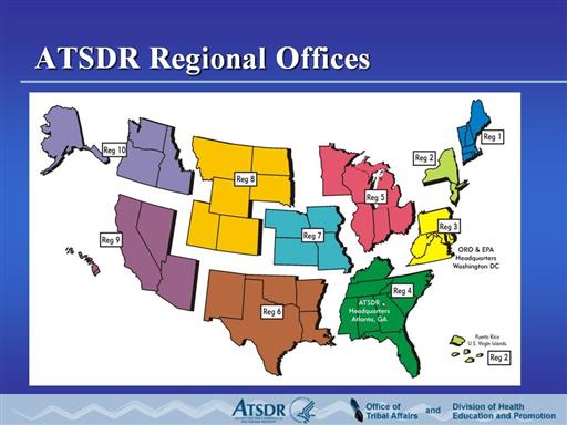 ATSDR’s headquarters are in Atlanta, Georgia. The agency has 10 regional offices and an office in Washington, D.C. |
