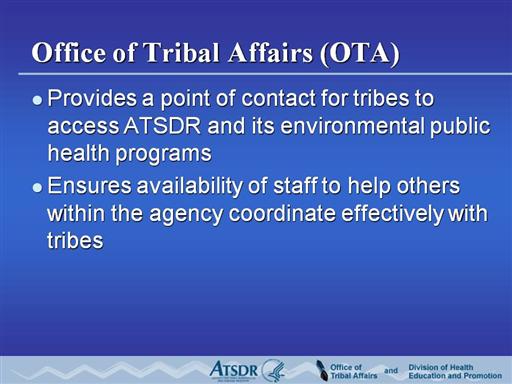 The ATSDR Office of Tribal Affairs responds to tribal requests for help with tribal-specific environmental health needs related to hazardous waste sites and pollution. |