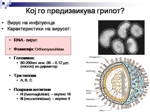 Внатрешните антигени (MP и NP протеините) се протеини специфични за типот на вирусот (тип-специфични антигени) што се користат за детерминирање на посебните вируси А, В и С. Овие протеини имаат вкрстена реактивност . Екстерните антигени (HA и NA) покажуваат повеќе варијации и се карактеристични за суб-типовите на вирусот. Тие се користат за идентификација на посебните подтипови на грипот тип А и се одговорни за епидемијата. Поддтиповите на грипот се именуваат според типот на хемаглутининот и на неуроминидаза протеинските антигени, на пр. како H3N2 за тип 2 хемаглутиназа и тип 3 неуроминидаза површински антигени. Ако два или повеќе подтипови на грипот инфицираат иста клетка истовремен, нивната протеинска и липидна обвивка се менува и RNA се транскрибира како mRNA. Клетката домаќин во тој случај формира нов вирус кој ги комбинира антигените. На пр. H3N2 и H5N1 може да формираат нов подтип H5N2 вирус. Бидејќи човековиот имунолошки систем не може да го препознае овој нов подтип, тој може да биде екстремно опасен. |